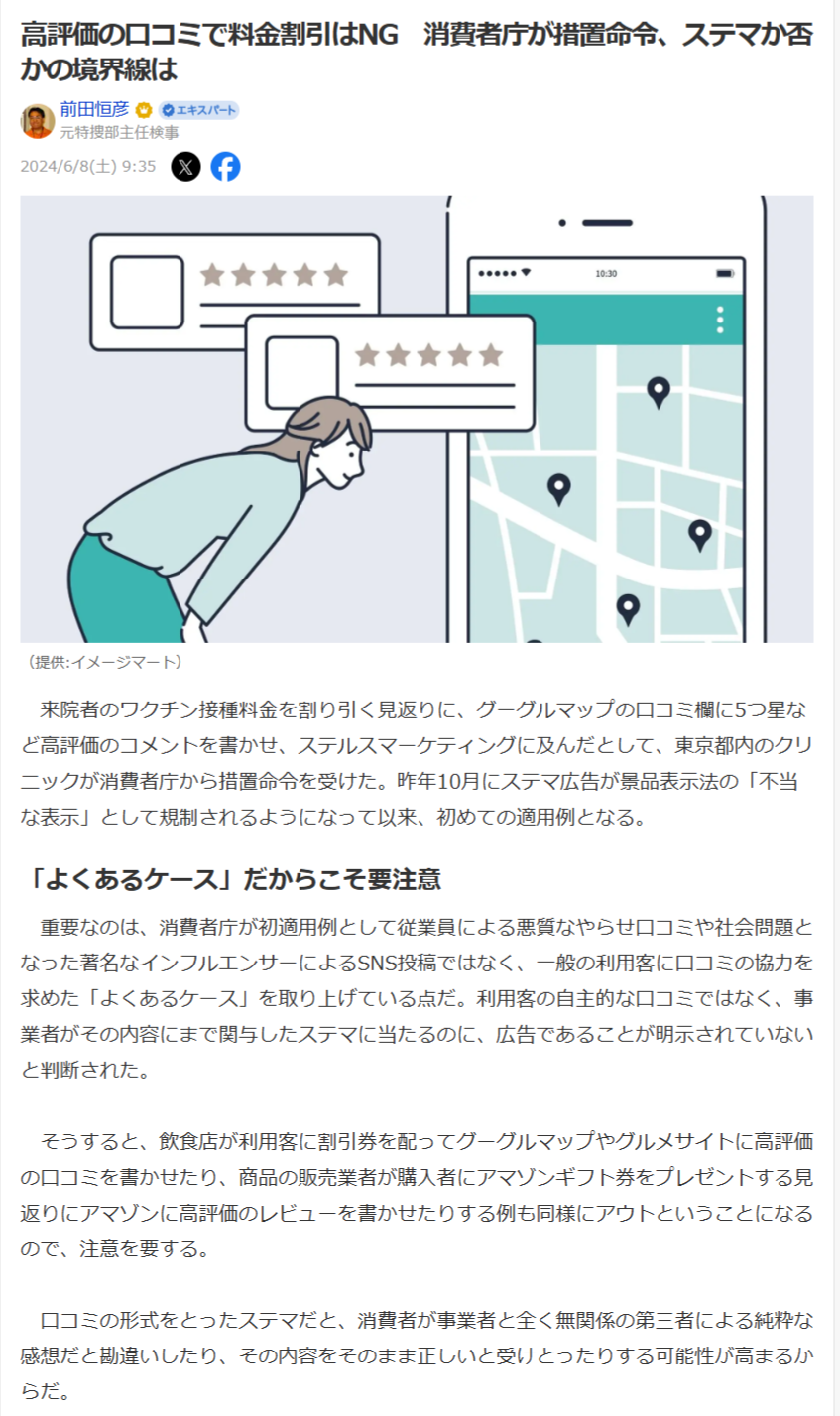 で、少し前に消費者庁が、『口コミ値引きはステルスマーケティングだから、止めるように』と措置命令を都内のクリニックに出しました。